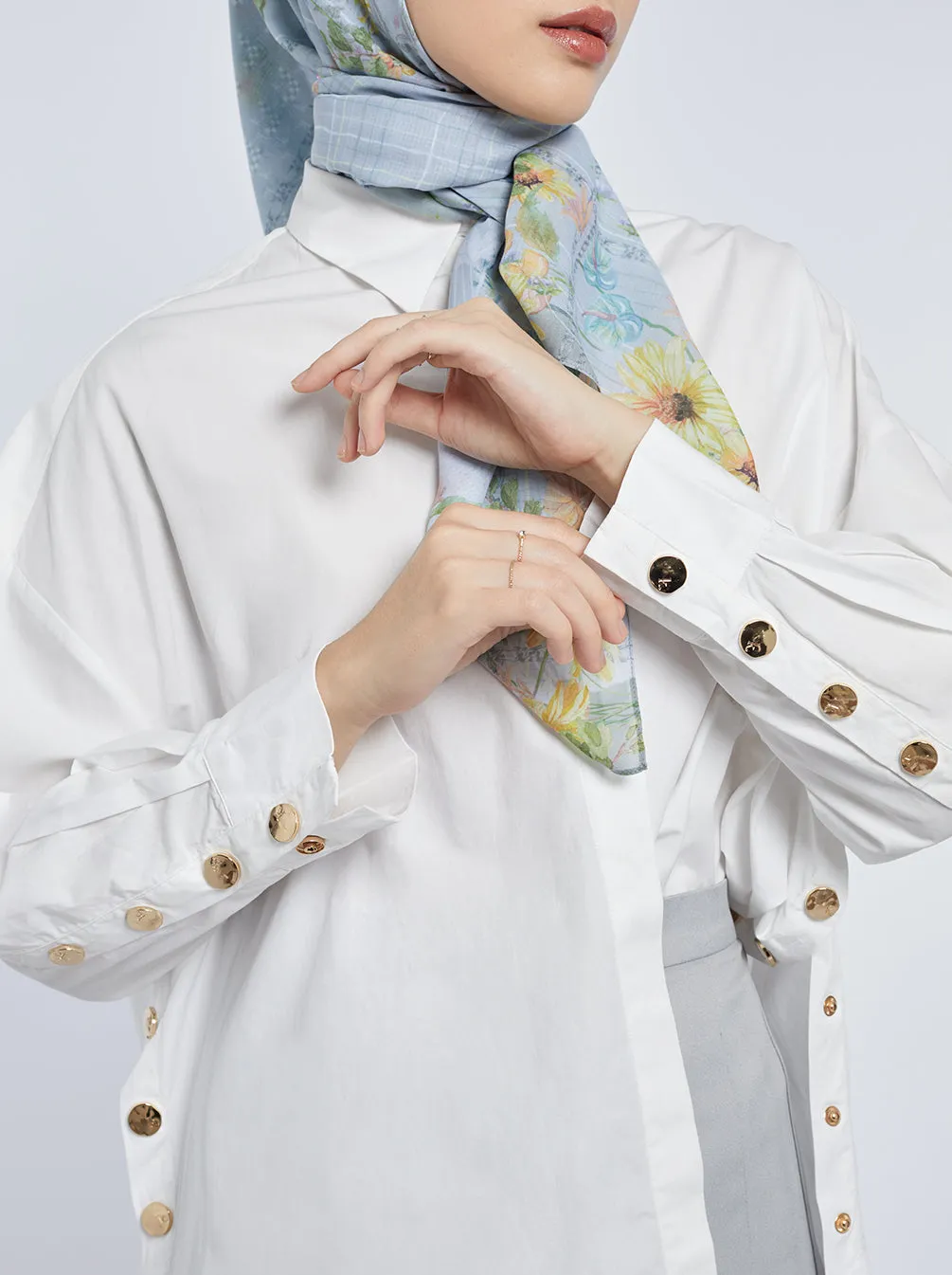 Oversize top made of cotton material with drop shoulder sleeves. Features marble button on the sleeves and side slits with gold snap button.