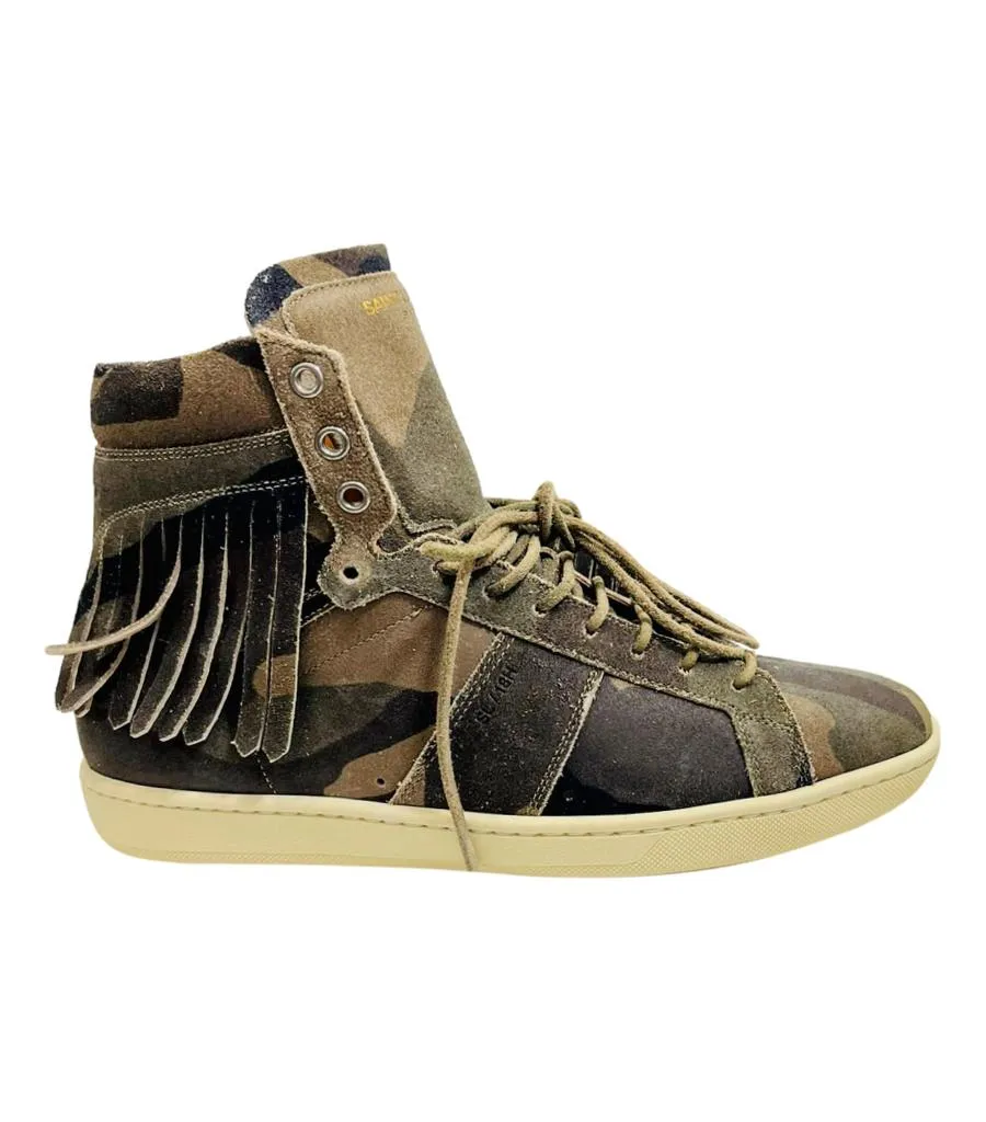 Camouflage print, lace-up high top sneakers. Embellished with suede